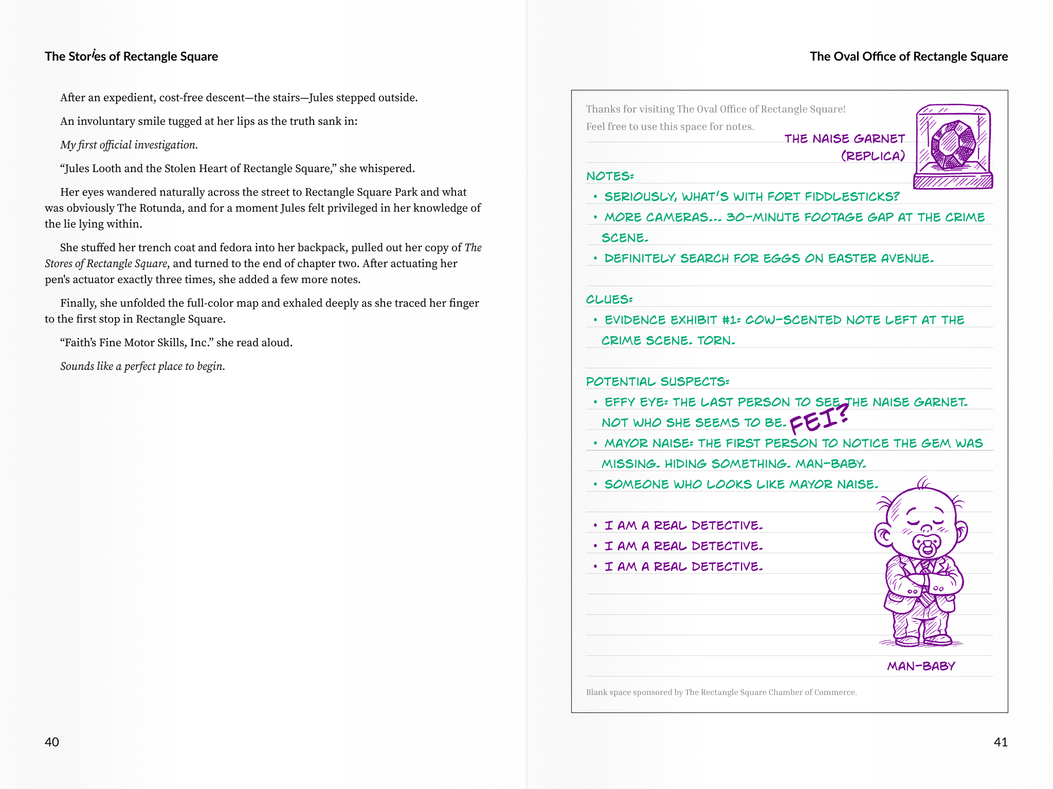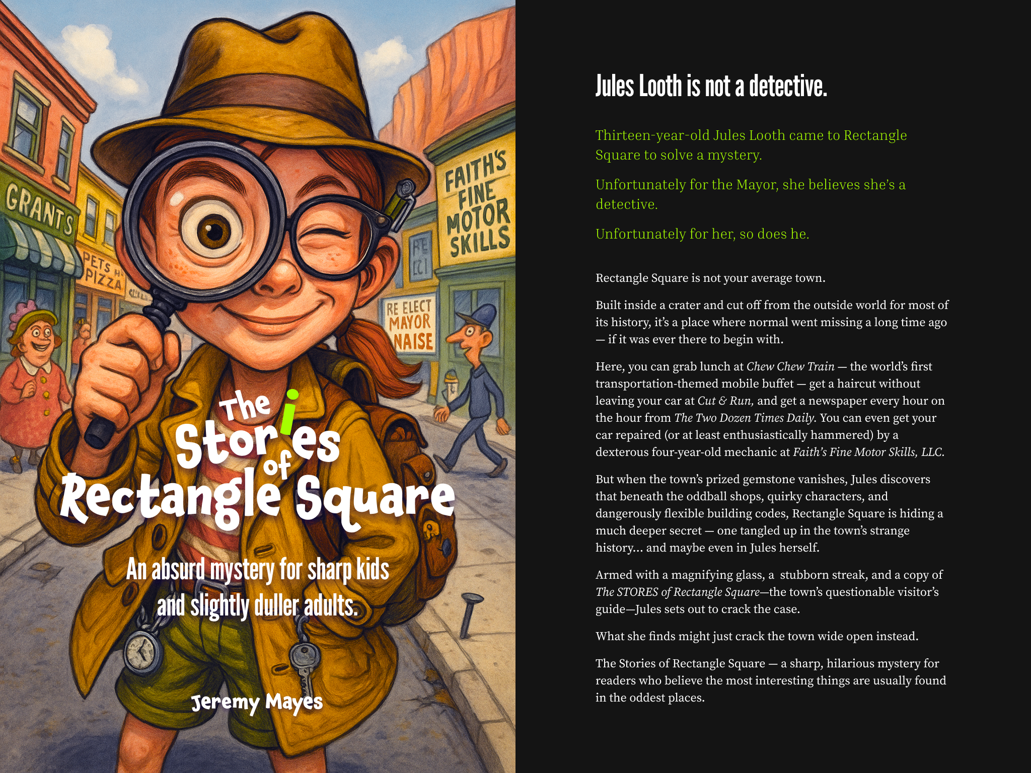 But when the town’s prized gemstone vanishes, Jules uncovers something stranger than oddball shops and eccentric locals. Armed with a magnifying glass, a stubborn streak a mile wide, and The STORES of Rectangle Square—the town’s questionable guidebook—she dives headfirst into a mystery that could crack the town wide open.